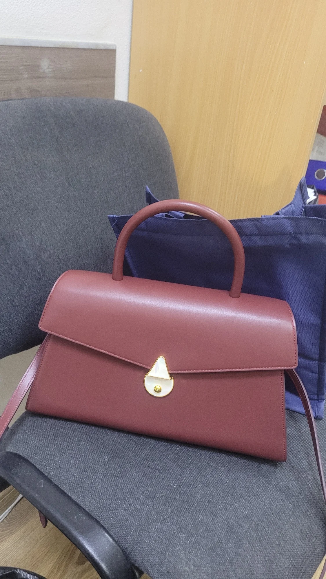 Very beautiful and high-quality medium-sized bag. Suitable for all occasions - for work, a walk, and the theater. If worn on a strap, it's better across the shoulder so it doesn't stick out, as the strap is attached to the back of the bag. The bag looks expensive. I recommend it.
