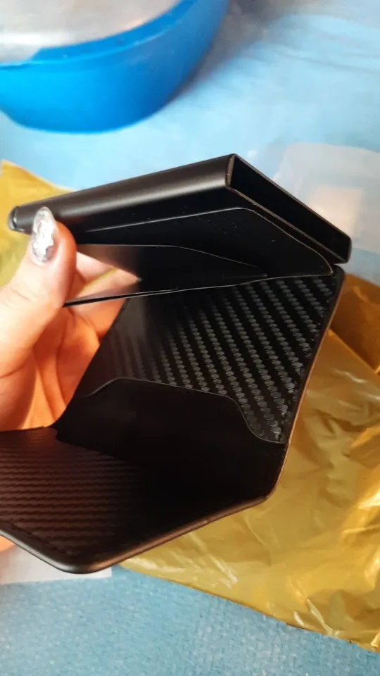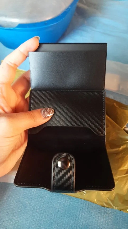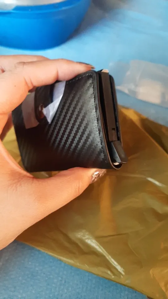The wallet combines premium carbon fiber-textured PU leather with a solid aluminum core, ensuring both durability and a stylish finish.