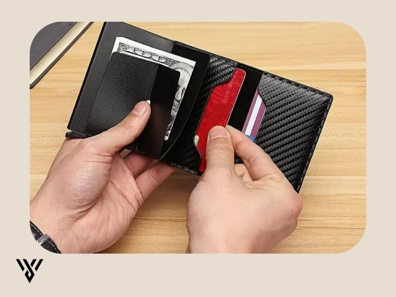 Slim, secure, and stylish — the VaultEdge RFID Wallet is built for those who value both form and function. Crafted with premium carbon fiber-textured PU leather and reinforced with a solid aluminum core, it shields your cards from RFID skimming while keeping your essentials neatly organized.